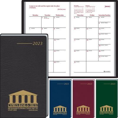 14 mos. (Dec.-Jan.). Includes two monthly calendar blocks and a thought-provoking quote on each open page spread, tips for the traveling executive, telephone and address pages, important dates, time zones and toll free numbers. Inside index cover includes an area code map and two-year reference calendar. - Imprint: 1 color included