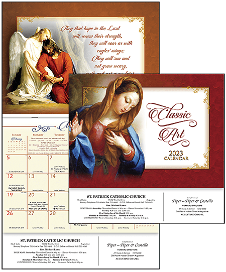 - Layout: The Classic Art calendar features beautiful Old Masters paintings. All necessary information for carrying out Catholic obligations is included in the calendar pad. The calendar features large squares for writing in important dates. (Canadian holidays are also shown.)