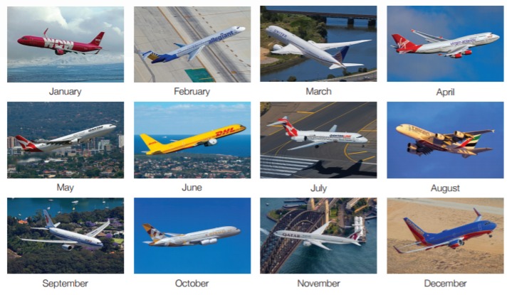 - Theme: 12 different commercial aircraft types and carriers from jumbo jets to island hoppers. This calendar is loaded with great shots of the "big birds".